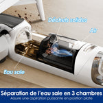 Technologie Tineco HyperStretch : permet au Stretch S6 de se comprimer jusqu'à une taille de seulement 13cm, assurant un nettoyage sans effort de la poussière sous les lits et dans les espaces restreints. Grâce à son système exclusif de séparation des eaux sales à 3 chambres, il extrait l'eau sale du moteur, garantissant ainsi une puissance de nettoyage totale même en position à plat.